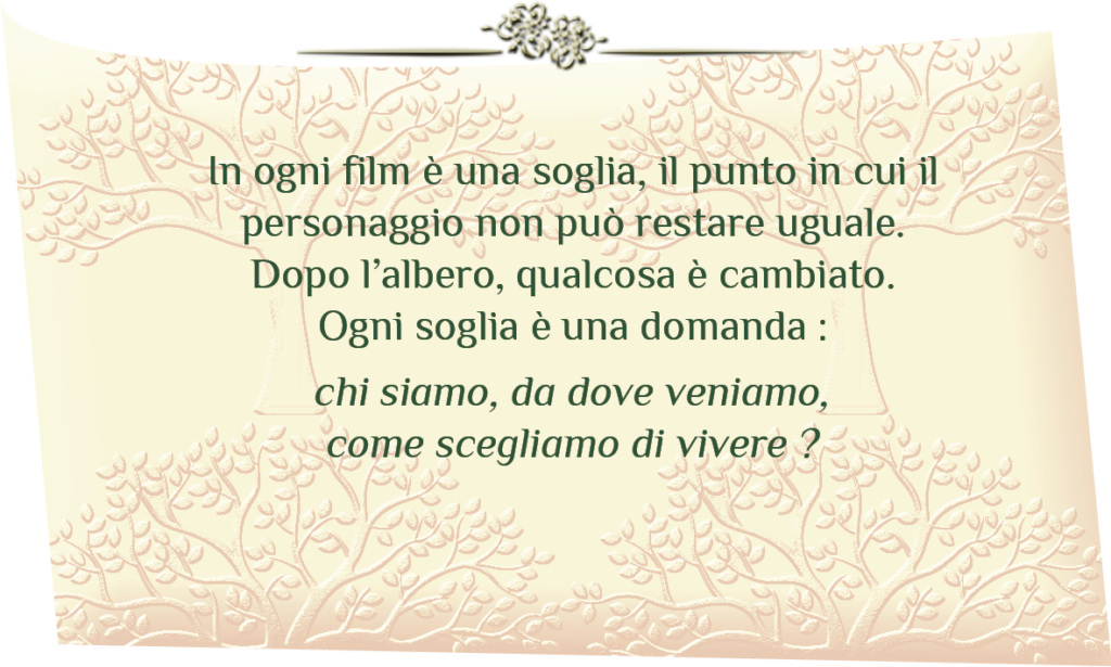 L’albero richiama direttamente il mito biblico dell’Albero della Vita, ma lo supera in chiave panteistica : Dio non è fuori dal mondo, è nel mondo. Nella luce che filtra tra i rami, nei gesti quotidiani, nel dolore e nella grazia.