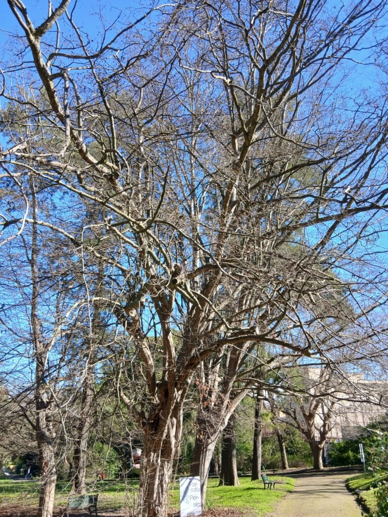 Una volta cadute le foglie, la sua corteccia si esfolierà in placche (come quella del platano), rivelando sfumature di grigio, rosa e giallo.