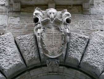 «D’azzurro, alla lupa al naturale, passante sulla pianura erbosa di verde, collarinata e legata d’oro ad un albero di codonio al naturale, fruttato d’oro, nodrito sulla pianura. Ornamenti esteriori da Comune.[8][9]»•