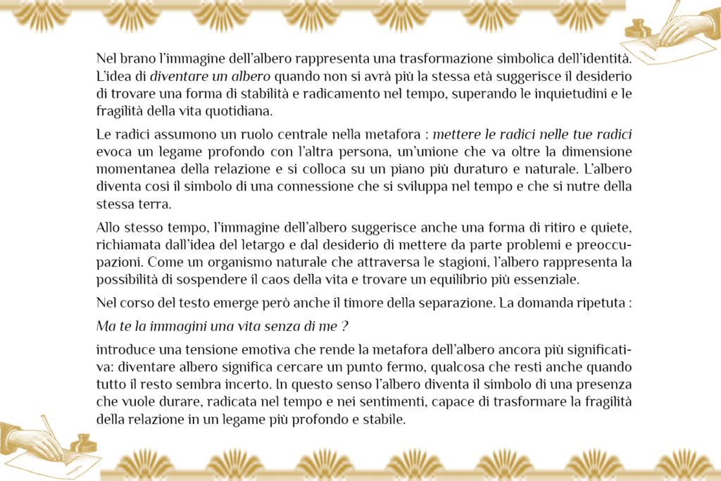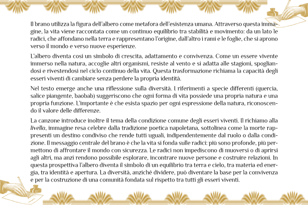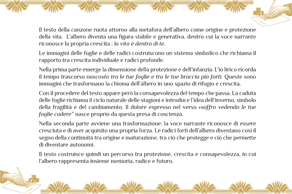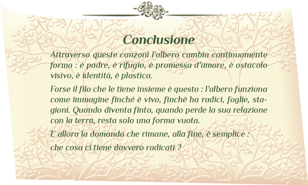 Nella musica, l’albero non è soltanto un’immagine naturale o decorativa. È una metafora profonda dell’esperienza umana, una struttura simbolica che permette di raccontare l’interiorità. Ci spinge a chiederci: da dove veniamo, chi diventiamo, cosa perdiamo e a cosa apparteniamo? L’albero è una delle immagini più semplici e più profonde che esistano. È qualcosa che vediamo ogni giorno, ma è anche una figura che attraversa il linguaggio dell’amore, della famiglia, della crescita, della solitudine, perfino dell’artificio. Nelle canzoni qui proposte, l’albero non significa mai esattamente la stessa cosa. A volte è concreto, a volte è un modo per dire “radici”, “origine”, “identità”, a volte è un rifugio, a volte è solo qualcosa che si vede dalla finestra e, ancora, a volte è finto, di plastica.