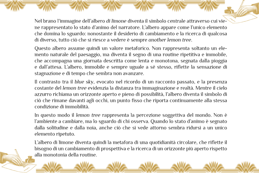 | [Verse 1] I’m sitting here in a boring room It’s just another rainy Sunday afternoon I’m wasting my time I got nothing to do I’m hanging around I’m waiting for you But nothing ever happens And I wonder [Verse 2] I’m driving around in my car I’m driving too fast, I’m driving too far I’d like to change my point of view I feel so lonely, I’m waiting for you But nothing ever happens And I wonder [Chorus] I wonder how, I wonder why Yesterday you told me ‘bout the blue, blue sky And all that I can see Is just a yellow lemon tree I’m turning my head up and down I’m turning, turning, turning, turning turning around And all that I can see is just another lemon tree [Post-chorus] Sing dah Dah-dah-dah-dam, dee-dab-dah Dah-dah-dah-dam, dee-dab-dah Dab-deedly dah [Verse 3] I’m sitting here, I miss the power I’d like to go out, taking a shower But there’s a heavy cloud inside my head I feel so tired, put myself into bed Well, nothing ever happens And I wonder [Bridge] Isolation is not good for me Isolation, I don’t want to Sit on a lemon tree [Verse 4] I’m steppin’ around in a desert of joy Maybe anyhow I’ll get another toy And everything will happen And you wonder [Chorus] I wonder how, I wonder why Yesterday you told me ‘bout the Blue, blue sky And all that I can see Is just another yellow lemon tree I’m turning my head up and down I’m turning, turning, turning, turning Turning around And all that I can see Is just a yellow lemon tree And I wonder, wonder I wonder how, I wonder why Yesterday you told me ‘bout the Blue, blue sky And all that I can see And all that I can see And all that I can see Is just a yellow lemon tree. | [Versetto 1] Sono seduto qui in una stanza noiosa È solo un’altra domenica pomeriggio piovosa Sto perdendo tempo, non ho niente da fare Sono in giro, ti sto aspettando Ma non succede mai niente E mi chiedo [Versetto 2] Sto guidando in macchina Sto guidando troppo veloce, Sto guidando troppo lontano Vorrei cambiare il mio punto di vista Mi sento così solo, ti sto aspettando Ma non succede mai niente E mi chiedo [Chorus] Mi chiedo come, mi chiedo perché Ieri mi hai parlato del Cielo azzurro, azzurro E tutto quello che posso vedere È solo un albero di limone giallo Sto girando la testa su e giù Mi sto girando, girando, girando, girando Girare attorno E tutto quello che posso vedere È solo un altro albero di limoni [Post-chorus] Canta dah Dah-dah-dah-dam, dee-dab-dah Dah-dah-dah-dam, dee-dab-dah Dab-dah dah [Versetto 3] Sono seduto qui, mi manca il potere Vorrei uscire, farmi una doccia Ma c’è una nuvola pesante nella mia testa Mi sento così stanco, mi metto a letto Beh, non succede mai niente E mi chiedo [Bridge] L’isolamento non mi fa bene Isolamento, non voglio Siediti su un albero di limoni Sto camminando in un deserto di gioia Forse comunque prenderò un altro giocattolo E tutto accadrà E ti chiedi [Chorus] Mi chiedo come, mi chiedo perché Ieri mi hai parlato del Cielo azzurro, azzurro E tutto quello che posso vedere È solo un altro albero di limone giallo Sto girando la testa su e giù Mi sto girando, girando, girando, girando Girare attorno E tutto quello che posso vedere È solo un albero di limone giallo E mi chiedo, mi chiedo Mi chiedo come, mi chiedo perché Ieri mi hai parlato del Cielo azzurro, azzurro E tutto quello che posso vedere E tutto quello che posso vedere E tutto quello che posso vedere È solo un albero di limone giallo. |