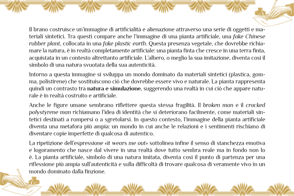 | Her green plastic watering can For her fake Chinese rubber plant In the fake plastic earth That she bought from a rubber man In a town full of rubber plans To get rid of itself It wears her out It wears her out It wears her out It wears her out She lives with a broken man A cracked polystyrene man Who just crumbles and burns He used to do surgery For girls in the eighties But gravity always wins And it wears him out It wears him out It wears him out It wears She looks like the real thing She tastes like the real thing My fake plastic love But I can’t help the feeling I could blow through the ceiling If I just turn and run And it wears me out It wears me out It wears me out It wears me out And if I could be who you wanted If I could be who you wanted All the time All the time | L’annaffiatoio di plastica verde Per la sua finta pianta cinese di gomma Nella finta terra di plastica Che lei ha comprato da un uomo di gomma In una città piena di piani gomma Per disfarsene Questo la infastidisce Questo la infastidisce Questo la infastidisce Questo la infastidisce Lei vive con un uomo distrutto Un uomo di polistirene in pezzi Che semplicemente si sbriciola e brucia Lui faceva il chirurgo plastico Per ragazze negli anni ’80 Ma la gravità vince sempre E questo lo infastidisce Questo lo infastidisce Questo lo infastidisce Questo… Lei sembra essere qualcosa di reale Ha il gusto di ciò che è reale Il mio falso amore di plastica Ma non posso resistere al sentimento Potrei andare via attraverso il soffitto Se solo mi girassi e corressi E questo mi infastidisce Questo mi infastidisce Questo mi infastidisce Questo mi infastidisce E se solo io potessi essere ciò che tu vorresti Se solo potessi essere ciò che tu vorresti Per sempre Per sempre |